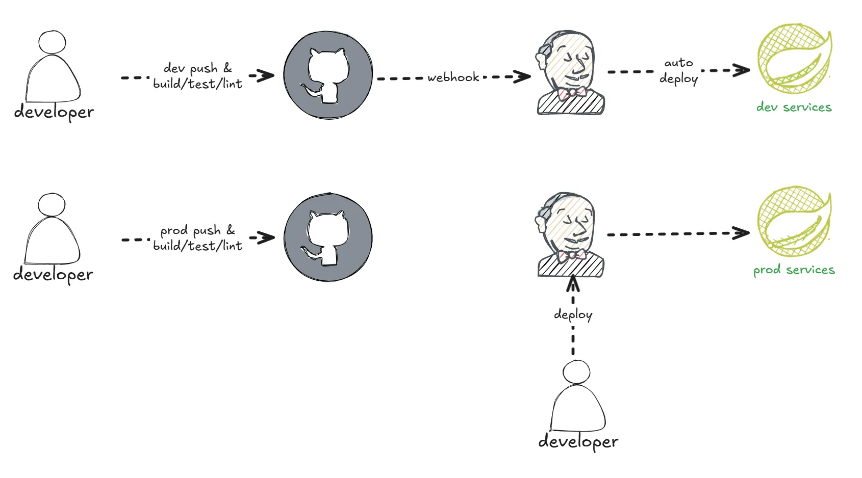 - production 서버는 merge 하는 담당 개발자가 jenking를 이용해 직접 deploy 한다.