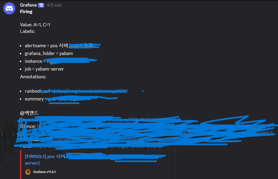 - Obserability 를 고려해 구축한 prometheus 와 grafana 를 사용해서 API 실패율에 따른 알람 요청을 디스코드로 확인할 수 있게 했다.